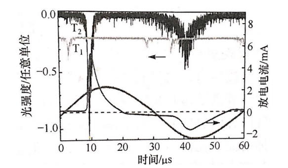 上图是在电压加大到4.5kV时的相应曲线。依据电流曲线能够看得出,电极间的放电进到非对称辉光放电方式。此时,尽管处于DBD区间的光信号T2与辉光放电的电流信号一致,可是高压电极外侧的光信号T1维持了流注方式的特点,其触发前沿仍超前电流信号的上升前沿,并没有进到类辉光放电。这表明,外加电压的增加改变了DBD区的放电方式,可是高压电极外的等离子体射流区的流注放电方式仍未受影响;也就是说,高压电极两边的等离子体是互相独立地形成和传播的。