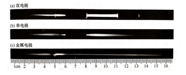 通过以上的实验能够看得出,尽管选用了DBD放电构型,可是等离子体射流事实上是由高压电极边缘的强电场击穿气体形成的,与DBD不相干。这就是说,等离子体射流是由电晕放电机制形成的。众所周知,电晕放电只需一个电极,那麼单个电极能形成等离子体射流吗?下面午夜精品久久久再对比一下三种不同电极构型形成的等离子体射流照片:图(a)是DBD构型形成的等离子体射流;图(b)是单个高压电极的电晕放电形成的等离子体射流,此时地电极已从石英管上移除;图(c)选用了直接与氦气流接触的金属片(厚0.05cm)作为电极形成的电晕放电,为了不影响气流,金属片中间钻了一个略大于毛细管内径的开口(直径0.25cm)。对比这三张照片可见,即便并没有DBD构型,所形成的等离子体射流仍十分类似。